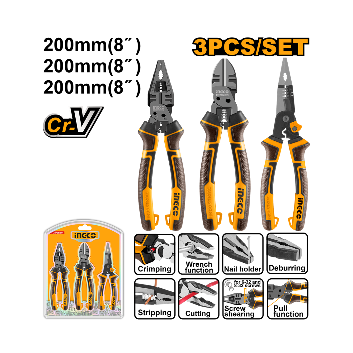 JOGO ALICATE MULTI FUNCAO 8″ C/3PC INGCO HKMPS2831